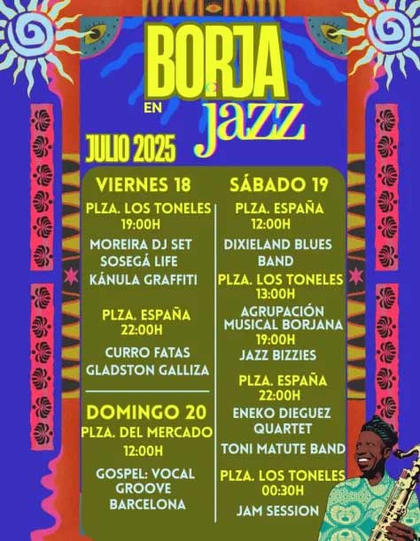 El sábado 19 se intensificará la actividad musical con un programa que incluye a la Dixieland Blues Band (12:00 horas, Plaza de España), la Agrupación Musical Borjana (13:00 horas, Plaza de los Toneles), Jazz Bizzies (19:00 horas, Plaza de los Toneles), y los conciertos nocturnos de Eneko Dieguez Quartet y Toni Matute Band (22:00 horas, Plaza de España). La jornada concluirá con una Jam Session a las 00:30 h en la Plaza de los Toneles.